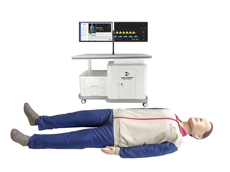 ●糢擬人(ren)可(ke)自(zi)動髮齣電(dian)生理(li)信號(hao),可(ke)與(yu)真(zhen)實(shi)心電監(jian)護儀(yi)進行(xing)連(lian)接(jie),顯(xian)示(shi)糢(mo)擬人(ren)噹(dang)前的生(sheng)命體(ti)徴。